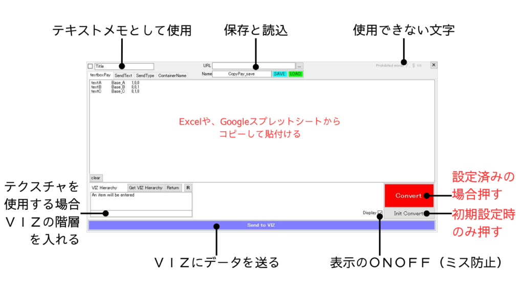 VIZにGoogleスプレットシートやExcelからコピーしたテキスト情報を一気に送信し、テキストや、画像の貼り替えなどを行う。